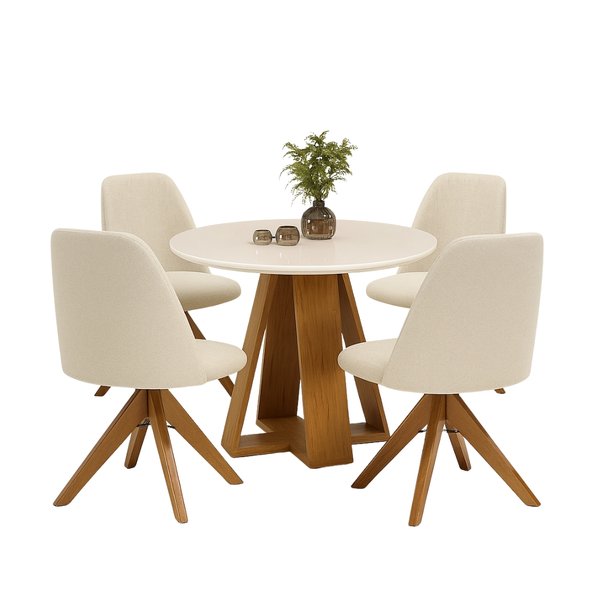 As quatro cadeiras giratórias complementam o conjunto com um toque de conforto e praticidade. Elas possuem assento e encosto estofados em tecido macio, que proporcionam bem-estar durante as refeições, e estrutura em madeira que garante durabilidade e beleza natural. O design leve e contemporâneo do conjunto Celeste faz dele uma excelente escolha para quem busca um ambiente acolhedor e sofisticado, sem abrir mão da funcionalidade e do estilo.