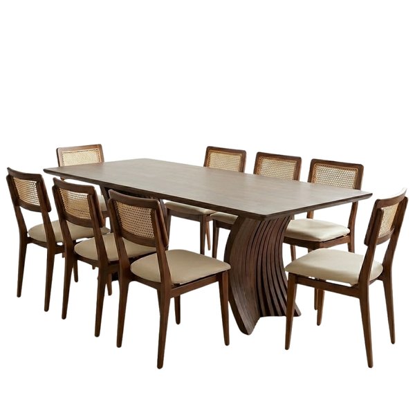 As 6 Cadeiras Teladas Jamule complementam o conjunto com charme e leveza. Sua estrutura em madeira, combinada ao encosto telado artesanal, oferece ventilação, conforto e um toque natural que harmoniza perfeitamente com a mesa maciça. O assento estofado traz aconchego durante as refeições, enquanto o design elegante das cadeiras adiciona personalidade ao ambiente. Juntos, mesa e cadeiras formam um conjunto sofisticado e atemporal, ideal para quem deseja unir estilo, funcionalidade e conforto em um único espaço.